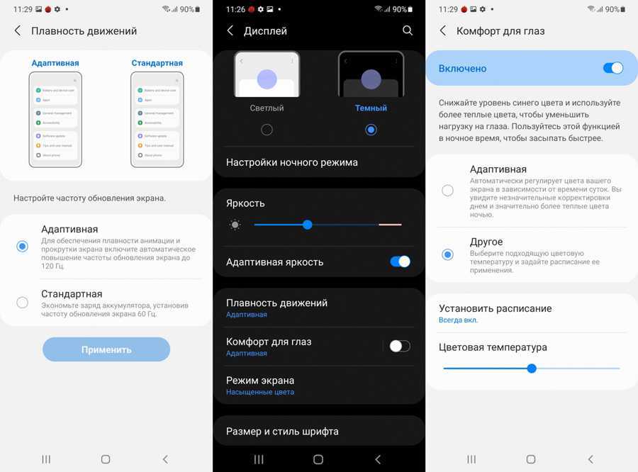 Уровень яркости Dynamic AMOLED-экрана можно регулировать вручную или перейти в автоматический режим, активировав опцию «Адаптивная яркость». Для включения «Ночного режима» по расписанию рекомендуется заблаговременно включить функцию определения местоположения. На вкладке «Плавность движений» для частоты обновления экрана рекомендуется установить опцию «Адаптивная», когда ее максимальное значение может достигать 120 Гц. В случае экономии заряда батареи рекомендуется включить стандартный режим (60 Гц). На вкладке «Комфорт для глаз» собраны соответствующие опции, которые предлагается запустить немедленно, либо по установленному графику. Международная компания SGS выдала сертификат (Eye Care Certification) за способность значительно снижать воздействие синего свечения.
