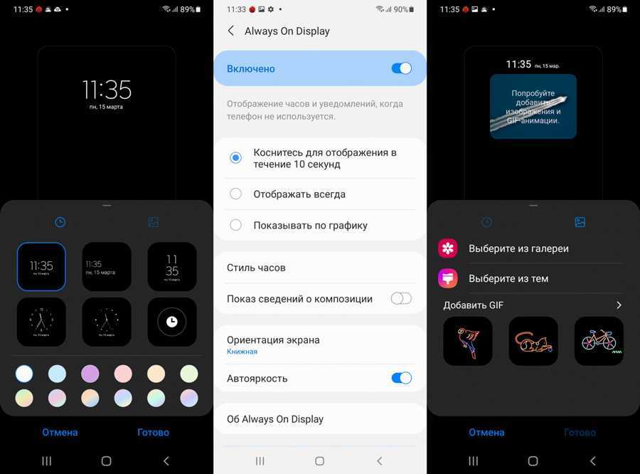 Напомним, что в режиме Always On Display на выключенный экран выводится информация, обычно включающая актуальное время, дату, день недели, уровень заряда батареи и т.п. Отображать все это предлагается постоянно, только после касания дисплея или по графику. Заметим, что стиль и цвет используемого изображения выбирается в настройках.