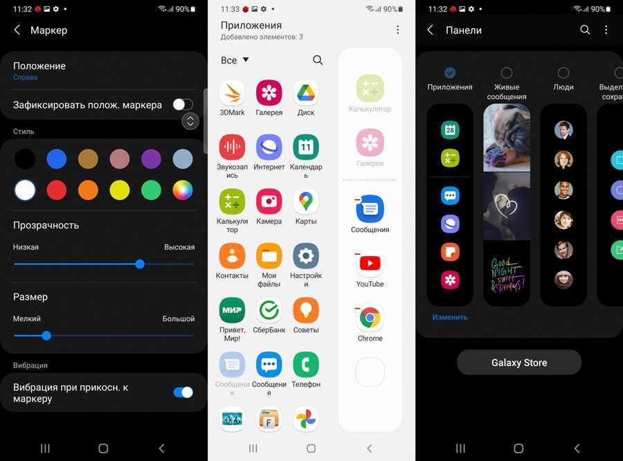 Визуализацию панелей Edge активирует настраиваемый маркер у одной из боковых граней экрана. Их предлагается использовать в качестве буфера, для быстрого доступа к часто используемым приложениям, к контактам близких друзей, а также для извлечения текста в выбранной области экрана и т.п.