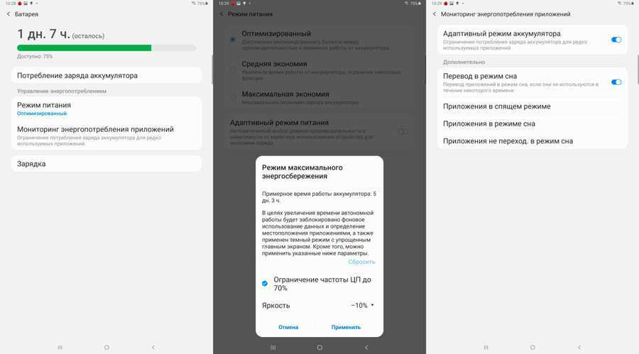 В настройках «Батареи» предлагается ряд опций, позволяющих увеличить время автономной работы смартфона. Например, в зависимости от типа нагрузки выбрать один из трех режимов: «Оптимизированный», «Средняя экономия», «Максимальная экономия», или автоматизировать свой выбор, воспользовавшись адаптивным режимом.