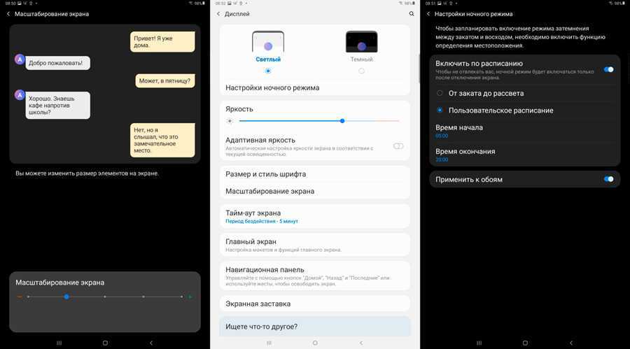 В настройки раздела «Дисплей» включены масштабирование элементов экрана и шрифта, с возможным изменением стиля последнего. Уровень яркости регулируется вручную или автоматически (опция «Адаптивная яркость»). Включить режим затемнения можно либо немедленно, либо от заката до рассвета, либо по расписанию пользователя. Хотя регулировки цветовой температуры в настройках нет, увеличить количество «желтизны» на экране можно прямо с панели быстрых переключателей, тапнув по пиктограмме «Фильтр синего». Олеофобное покрытие на защитном стекле имеется, но, вообще говоря, не очень впечатляет.