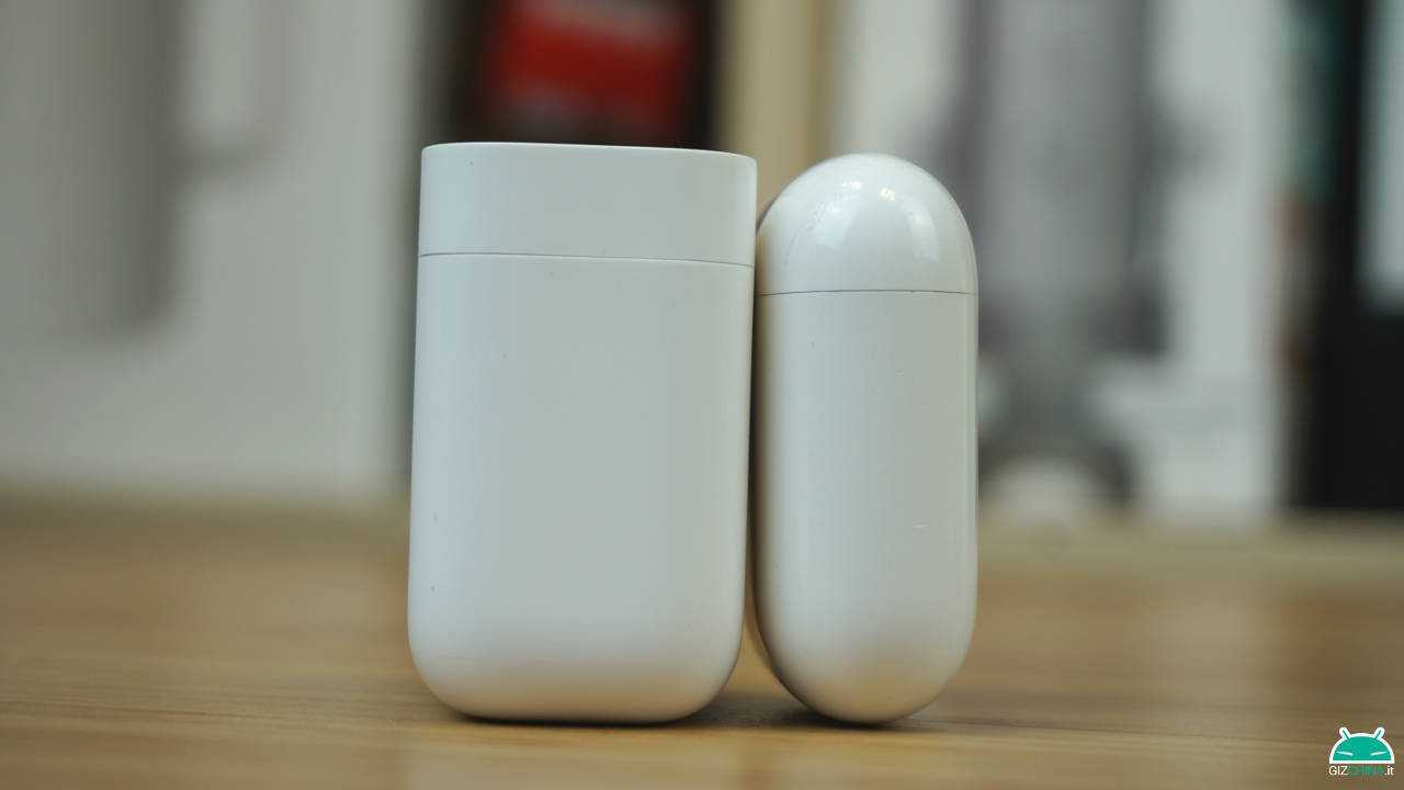 Кейс также в пленке. В его внешнем виде разработчики Xiaomi решили не повторять за Apple, и сделали свой дизайн корпуса. Тоже лаконичный, но более угловатый. Кто-то в этом видит минус, но как по мне, смотрится он вполне современно. И в таком виде, когда его можно вертикально поставить на стол, это даже в каком-то случае более практично. Хотя, в кармане носить его менее удобно.