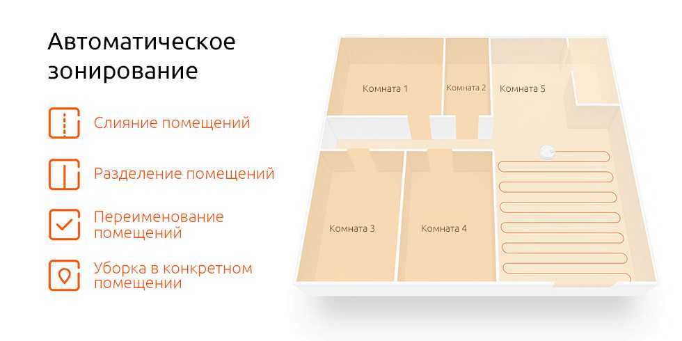 После окончания первой уборки умный пылесос Xiaomi распознает помещения и автоматически разбивает их на комнаты по типам. Вы же можете разбивать помещения, соединять или переименовывать их, чтобы потом было проще управлять пылесосом.