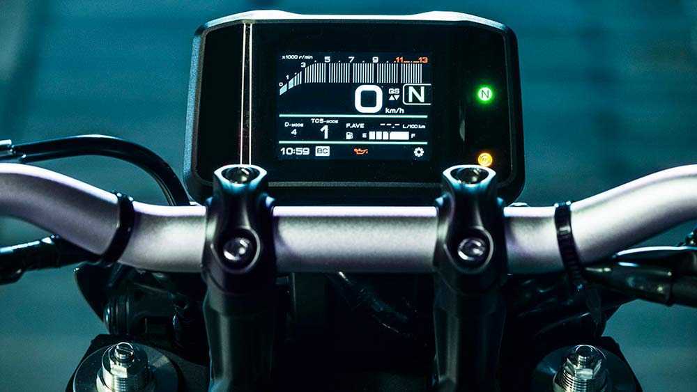 MT-09 оснащен 3,5-дюймовым полноцветным TFT-дисплеем с тахометром в виде полосок, который меняет цвет при увеличении или падении оборотов, часами и дисплеями для оставшегося топлива, среднего пробега температура воды, воздуха и индикатор переключения передач (цвет меняется на противоположный для используемой передачи). Легко переключайтесь между дисплеями и информацией с помощью переключателей на руле.
